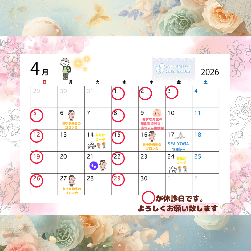 2026年4月の診療スケジュールとSEA AREAイベントカレンダーができましたのでお知らせいたします。受診やご予約、親子イベントへのご参加の目安にしていただけたら嬉しいです。